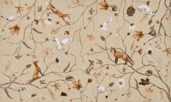 Ce design raffiné montre un jeu gracieux d'animaux et de nature, subtilement tissé dans un motif de branches sinueuses, de fleurs fanées et de feuilles d'automne. Dans cette scène paisible, nous découvrons des renards, des hérissons, des lapins, des écureuils, des belettes et des chouettes, tous dans un équilibre délicat entre mouvement et silence. Le fond beige sable apporte chaleur et neutralité, tandis que les accents doux de rouille, crème, caramel et brun confèrent une allure élégante et automnale. Les animaux semblent presque danser dans le jeu organique des lignes des branches et de la flore. Tout est illustré avec légèreté, ce qui rend le design à la fois raffiné et ludique. La palette de couleurs est douce et harmonieuse, maintenant une ambiance visuellement calme malgré les détails riches. Ce design s'intègre parfaitement dans un intérieur Japandi ou moderne rustique, où les matériaux naturels, les tons apaisants et les formes organiques sont à la base. Pensez à des meubles en bois clair, des rideaux en lin, des accessoires en laine et des décorations en terre cuite dans des tons sable et terre cuite. Dans une chambre d'enfant, ce design crée un effet féerique et apaisant, sans être enfantin. Il est parfait pour les espaces où le calme et l'imagination vont de pair : une chambre de bébé, un coin lecture, une aire de jeu tranquille ou même un espace de travail avec une inspiration naturelle. La structure répétitive le rend adapté aux grands murs, où le design se sent comme une texture décorative. Il invite à l'exploration tout en restant élégant et stylé. Cette composition rayonne d'une beauté discrète, avec une touche d'émerveillement.
