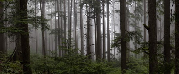 Un panorama d'une forêt sombre et lugubre par un jour de brouillard.