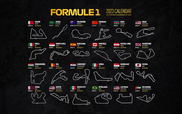 Formula 1 2023 - Winners map. Op dit fotobehang staan alle races uit 2023 met de winnaar van elke race.