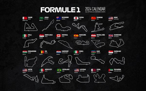 Formula 1 2024 - Data map. Op dit fotobehang staan alle races die in 2024 zijn gepland.
