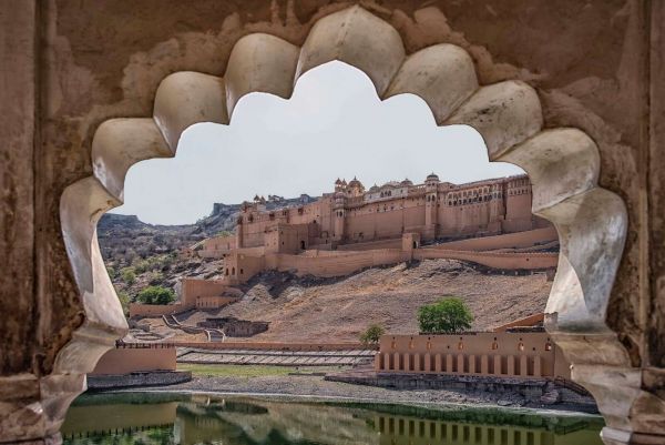 Un majestueux fort couleur sable s'élève dans un paysage désertique aride, entouré d'arcs élégants sculptés. La réflexion dans l'eau calme donne l'ensemble une allure sereine et imposante.