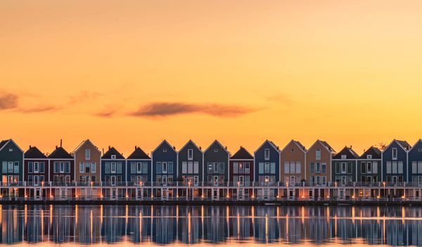 Fragile comme une plume sur Papier peint photo. Une rangée de maisons au bord de l'eau avec un ciel orange en arrière-plan.
