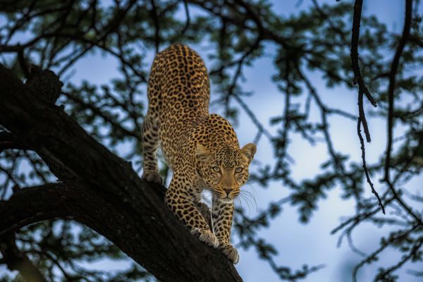 Going Down With Caution sur Papier peint photo. Un léopard se faufile prudemment dans un arbre.