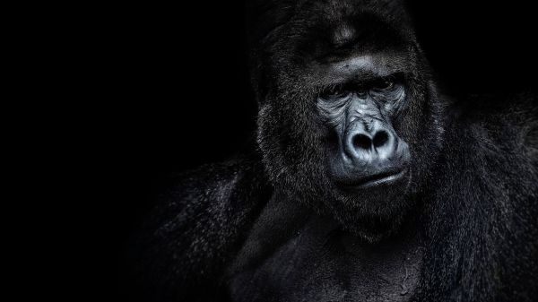 Une belle photo de portrait d'un gorille sur un fond noir.