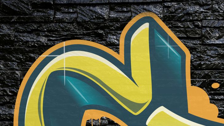 Graffiti sur un mur de pierre noire. Grâce aux pierres noires, les graffitis de ce papier peint ressortent joliment.