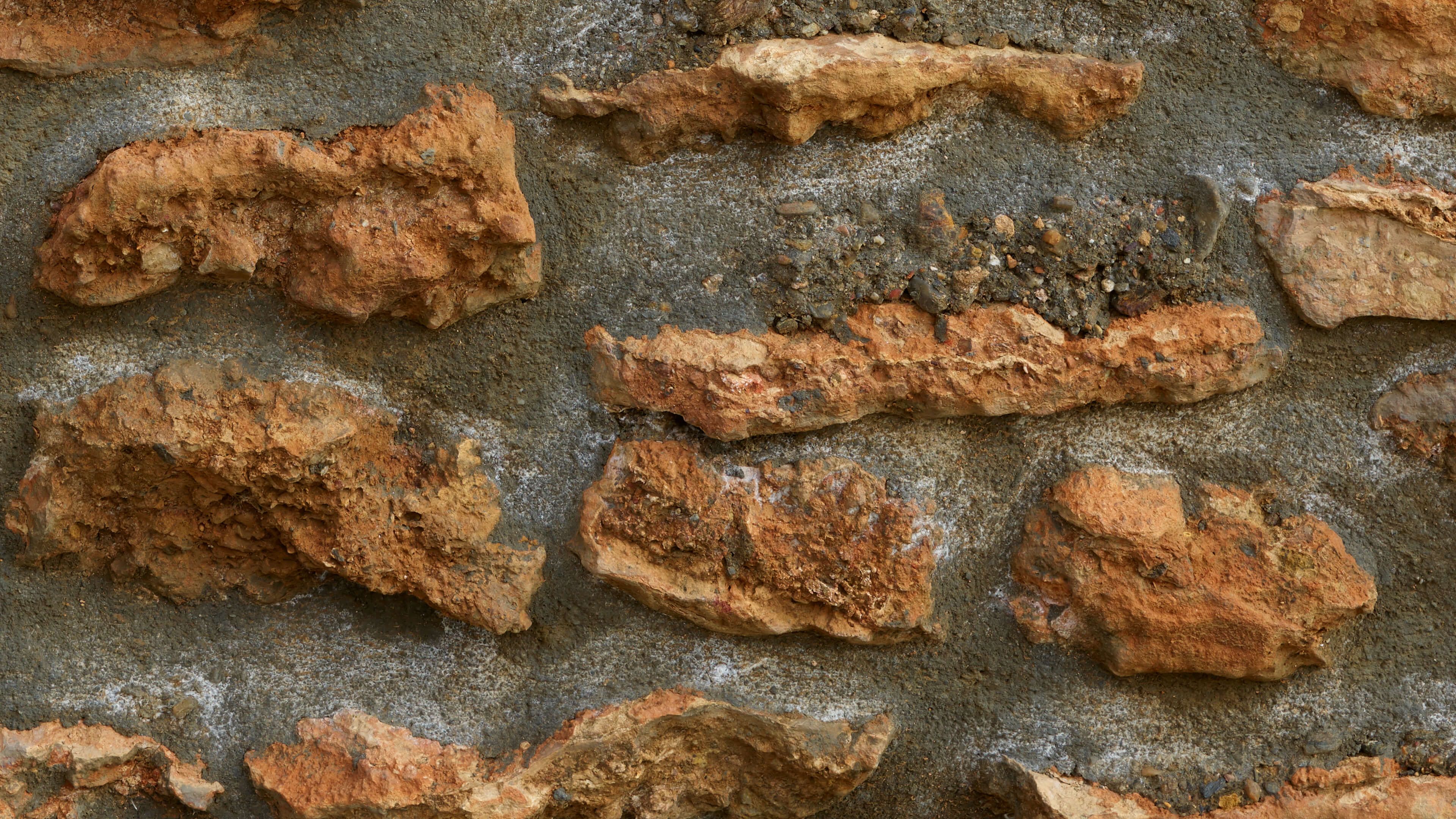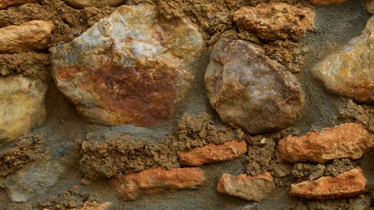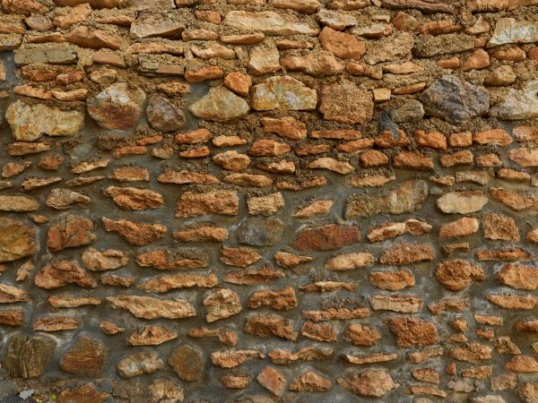Grand mur avec des pierres brutes de différentes tailles en différents matériaux