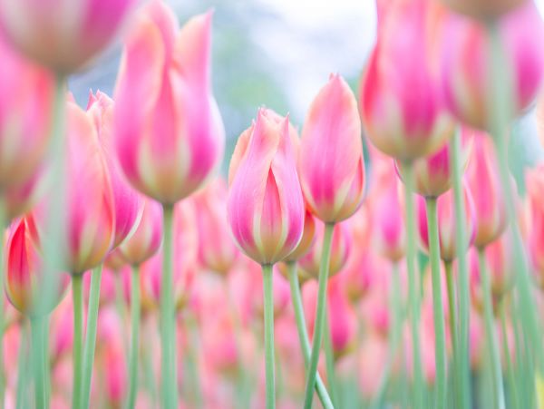 Un beau gros plan de tulipes roses dans un champ de tulipes. Appliquez ce papier peint dans votre maison pour encore plus d'ambiance.