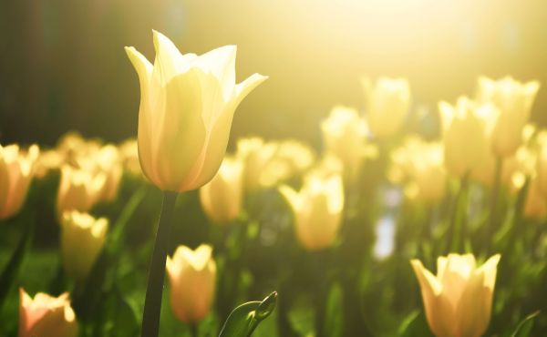 Gros plan d'un champ de tulipes jaunes sur fond flou