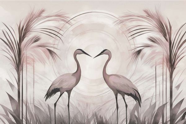 Deux élégants grues se font face dans un cadre serein et rêveur. Des teintes pastel douces de rose et de beige se mêlent à des feuilles tropicales subtiles et à un soleil abstrait en arrière-plan. La composition harmonieuse dégage calme et élégance, parfaite pour une ambiance raffinée et stylée.