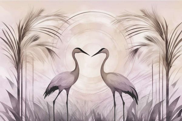Deux élégants grues se font face harmonieusement, entourés de palmiers gracieux et d'un arrière-plan subtilement stratifié. Les douces teintes beige et gris-brun dégagent sérénité et calme. Le style aquarelle délicat et la composition symétrique confèrent à l'ensemble une allure rêveuse, presque méditative.