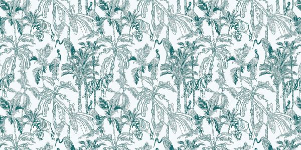 Motif de grues et de tigres verts avec des plantes exotiques.