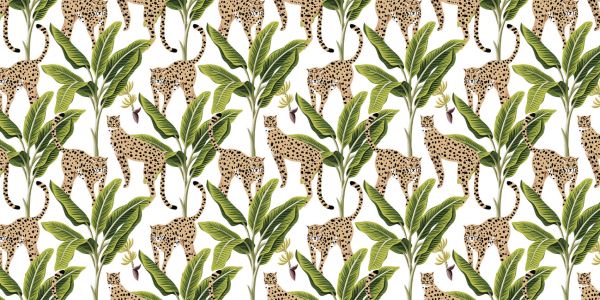 Bananiers tropicaux et guépards sur un fond blanc.