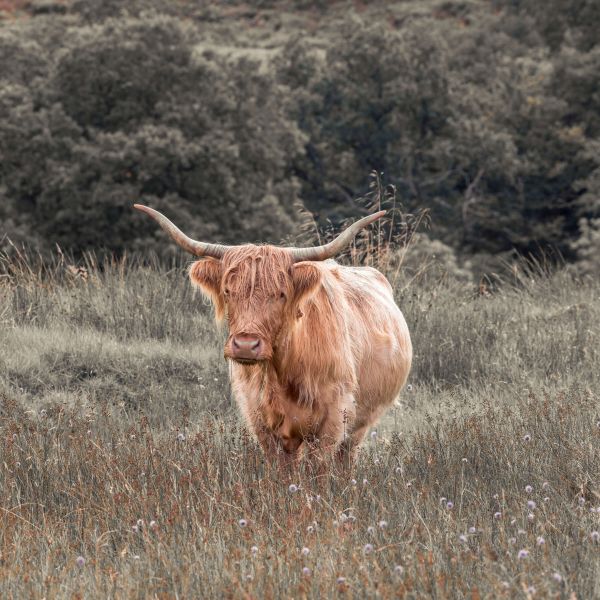 Un highlander écossais dans un champ. Le highlander se tient dans une zone vallonnée et regarde devant lui.