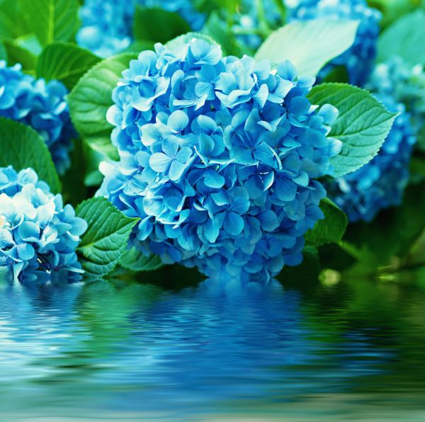 Hortensias bleus dans l'eau. Combinez-les dans le salon, par exemple, pour plus d'ambiance.