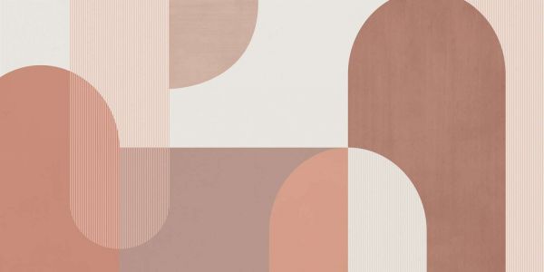 Ce design offre une douce harmonie de couleurs pastel chaudes et de formes structurées. Les arcs et les rectangles qui se chevauchent, certains avec une délicate texture rayée, créent une superposition qui ajoute à la fois une profondeur visuelle et une touche d'élégance.