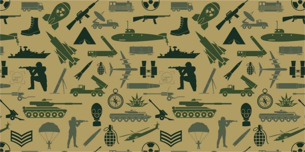 Papier peint marron avec diverses illustrations militaires, comme un hélicoptère, un parachutiste, une grenade à main et une fusée.