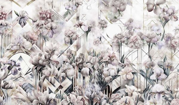Un design raffiné et intemporel où des fleurs luxuriantes comme des iris et des pivoines se mêlent à des motifs Art Déco élégants. Les douces teintes sépia et grises créent une ambiance vintage, tandis que les lignes géométriques apportent une touche moderne et luxueuse. Un jeu harmonieux de la nature et de l'élégance architecturale.