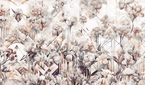 Ce magnifique design combine l'élégance luxuriante des fleurs avec la précision symétrique du style Art Déco. Les iris et les pivoines détaillés fleurissent sur un fond de motifs géométriques raffinés, créant un mélange unique de romantisme et de classe architecturale. Les teintes chaudes de sépia, de crème et d'or apportent une sensation de luxe vintage et de raffinement intemporel.