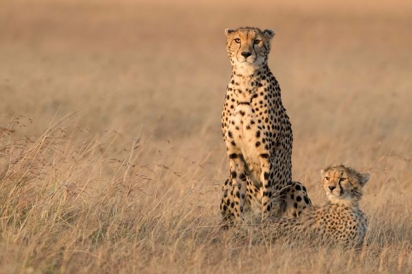 Papier peint d'un guépard avec son petit sous le soleil du matin.