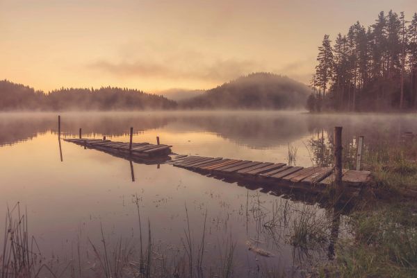 Un lac au lever du soleil. Le brouillard plane toujours sur l'eau.