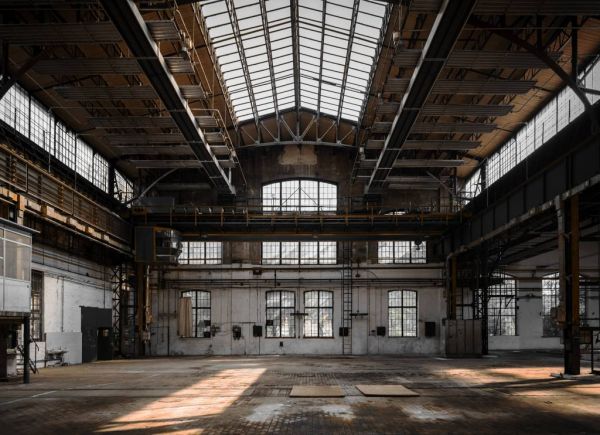 Papier peint avec un vieux hall industriel abandonné avec une belle lucarne et de nombreuses fenêtres à l'intérieur.