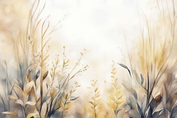 Un design aquarelle rêveur avec des teintes douces d'or, de beige et de gris-bleu. De fines et gracieuses brins d'herbe et des feuilles délicates donnent une apparence apaisante. La lumière subtile et les transitions de couleurs fluides créent une atmosphère chaleureuse et naturelle, parfaite pour un intérieur harmonieux et accueillant.