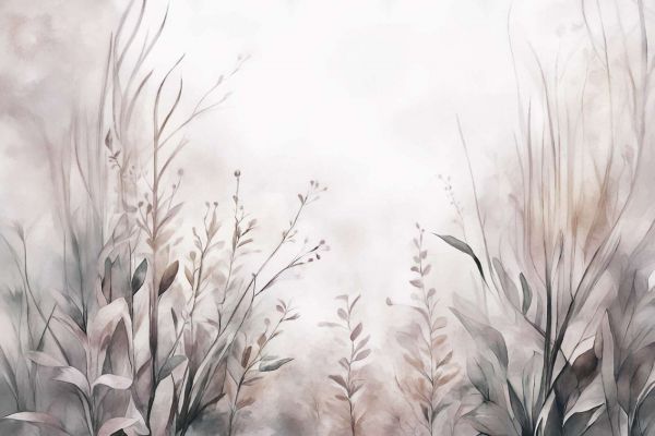 Une aquarelle sereine dans des teintes douces de violet et de lilas, enrichie de feuilles raffinées et de brins d'herbe. Ces transitions de couleurs subtiles et ces structures délicates créent une atmosphère calme et accueillante, parfaite pour un intérieur raffiné et confortable.