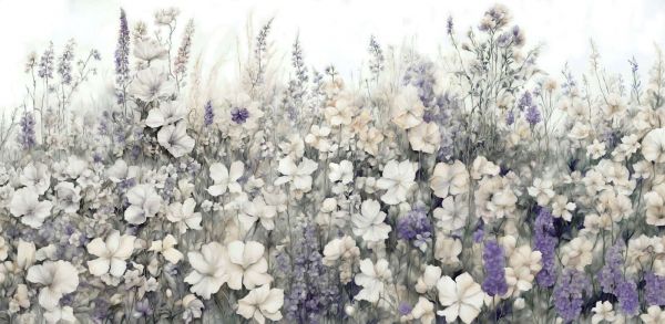Ce design capture la magie d'un doux champ de fleurs dans un style rêveur et serein. Les délicates fleurs blanches et lilas, allant de fragiles fleurs en boutons à des épis floraux luxuriants, forment une scène harmonieuse qui évoque un sentiment de paix et de raffinement. Les teintes aquarelle subtiles offrent une apparence douce et élégante, permettant au design de s'intégrer sans effort dans divers styles d'intérieur.