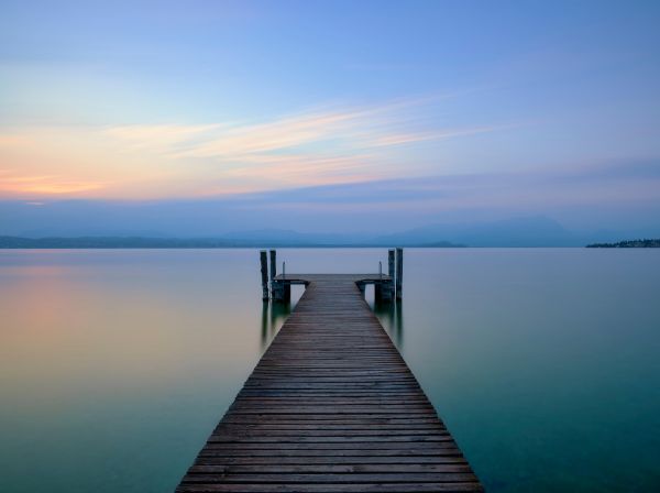 Belle jetée en bois au coucher du soleil. Ce papier peint donne immédiatement plus d'atmosphère à la pièce.