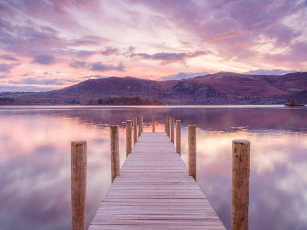 Papier peint d'une jetée sur un lac lors d'un coucher de soleil nuageux.