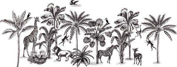 Jungle animale composée de lions, de girafes, de singes, de cerfs et bien plus encore. Papier peint branché et tendance.