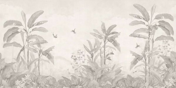 Cette élégante illustration apporte une atmosphère tropicale sereine à la vie dans des tons de gris délicats. De grandes plantes de bananiers dominent la composition, avec leurs feuilles imposantes et leurs subtils détails de texture. En dessous se déploie une riche couche de végétation composée de fleurs et de plantes tropicales, tandis que des colibris gracieux et des papillons ajoutent une sensation de légèreté et de mouvement à la scène paisible. Grâce au style noir et blanc discret, ce design s'intègre parfaitement dans les styles d'intérieur modernes et classiques. Dans un intérieur moderne, il peut être associé à des bois clairs, des meubles minimalistes et des textiles naturels tels que le lin ou le coton. Dans un intérieur classique, il apporte une touche de raffinement, surtout en combinaison avec des meubles en bois foncé, des accents antiques et des tissus veloutés doux. La palette de couleurs est composée de différentes nuances de gris, créant une base intemporelle et neutre. Le trait fin et les détails botaniques réalistes confèrent une apparence artistique adaptée aussi bien aux lofts urbains qu'aux maisons de campagne. La combinaison de la flore et de la faune apporte la tranquillité, tandis que l'absence de couleur apporte de l'élégance et de la polyvalence. Ce design s'épanouit particulièrement dans une chambre à coucher, un bureau à domicile ou une véranda, offrant calme et inspiration. Il crée également une ambiance naturelle et luxueuse dans un hall d'hôtel ou un espace bien-être sans dominer visuellement.