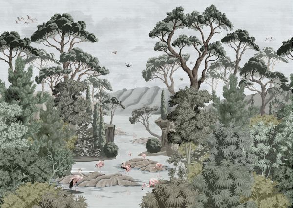 Papier peint d'une jungle vintage avec des oiseaux, des flamants roses et une rivière. Combinez-le dans votre chambre d'enfant.