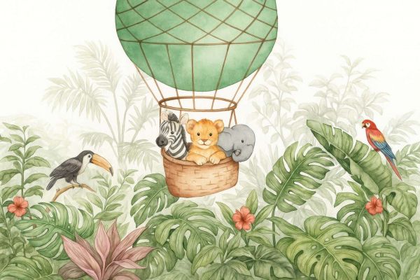 Dans cette illustration enchanteresse de jungle, une montgolfière s'élève entre le feuillage tropical, avec trois voyageurs adorables à bord : un zèbre, un lionceau et un petit éléphant. Ils planent au-dessus d'une riche canopée de monstera, de palmiers et de fleurs colorées, tandis qu'un toucan et un perroquet observent curieusement depuis leurs branches. Le palette de couleurs est harmonieuse et douce avec du vert jungle frais, des roseaux couleur sable, et des tons d'animaux chauds en gris, orange et noir et blanc. La montgolfière en vert doux avec un motif de grille fin forme un beau point central. Grâce au trait subtil et au style aquarelle, la composition semble aérienne et apaisante, malgré les détails riches dans le feuillage tropical. Parfait pour les chambres de bébé ou de tout-petit avec un thème jungle, safari ou aventure. Associez ce design à des matériaux naturels tels que le rotin, le bambou ou le bois clair. Pensez à des accessoires tels que des paniers de rangement en herbe marine, un mobile avec des animaux de la jungle ou des coussins en forme de feuilles et d'animaux. Des couleurs textiles douces comme le vert mousse, le beige ou la terre cuite se marient parfaitement avec ce style. Applicable comme un point focal ludique au-dessus d'un lit ou d'une commode, ou comme un arrière-plan chaleureux dans un coin lecture ou de jeu. Ce design stimule l'imagination et invite les enfants à partir à l'aventure, tout en offrant calme et sécurité grâce à son utilisation de couleurs douces.