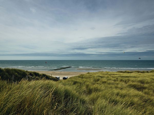Vue de la plage depuis les dunes avec des cottages et des kite surfers. Faites entrer la plage dans votre maison avec ce papier peint.