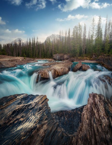 Une rivière qui coule avec une belle eau bleue et des montagnes en arrière-plan.