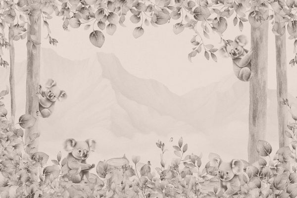 Des koalas confortables accrochés aux eucalyptus, entourés d’une flore florissante, le tout capturé dans de doux croquis au crayon qui créent une atmosphère chaleureuse et accueillante.
