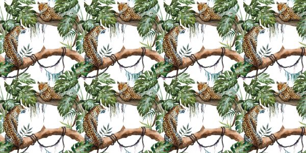Motif aquarelle de léopards et de feuilles de la jungle sur un fond blanc.