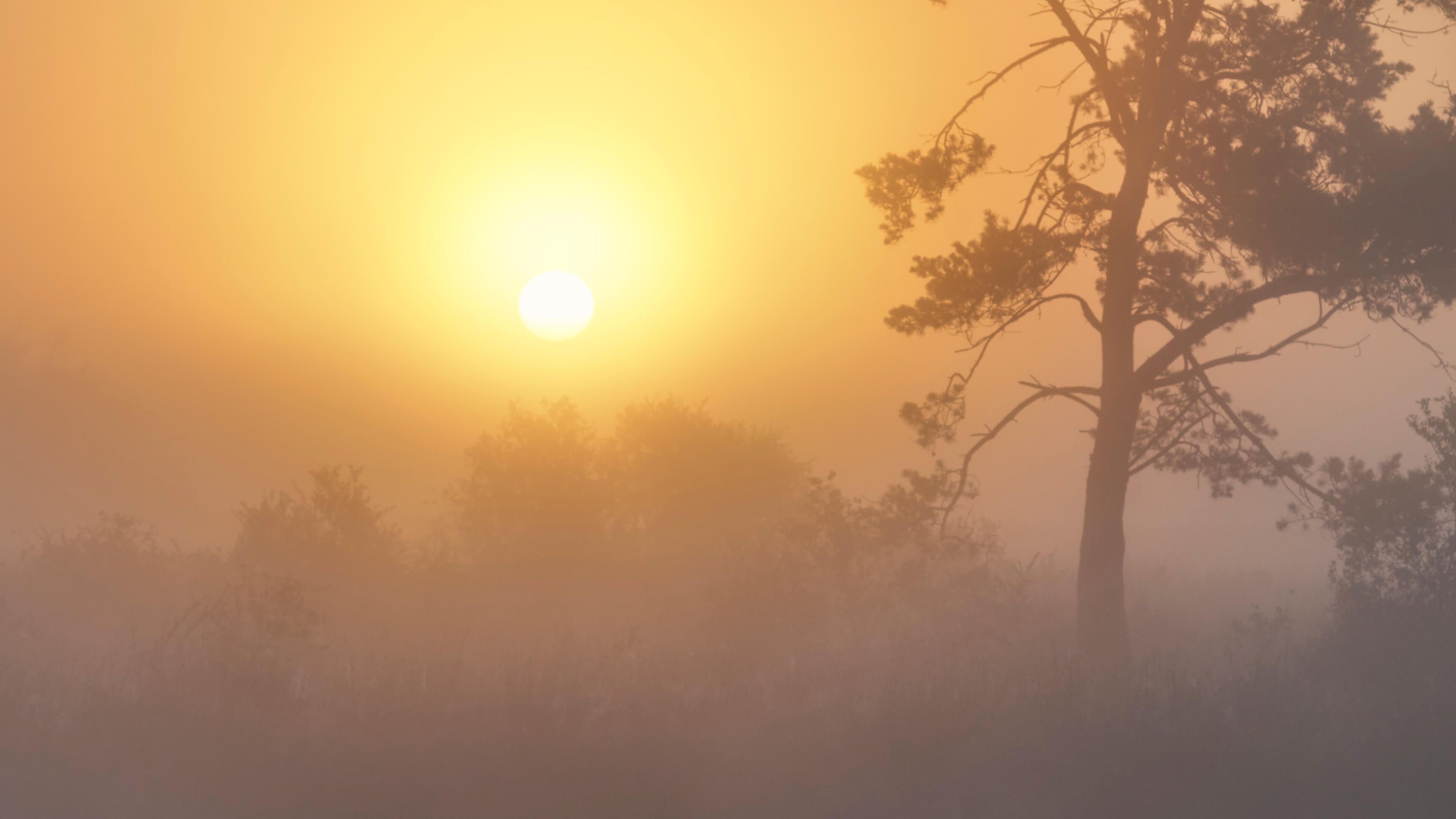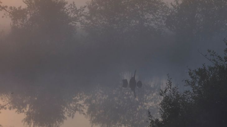 Brouillard au lever du soleil dans une belle lande avec de l'eau encore réfléchissante