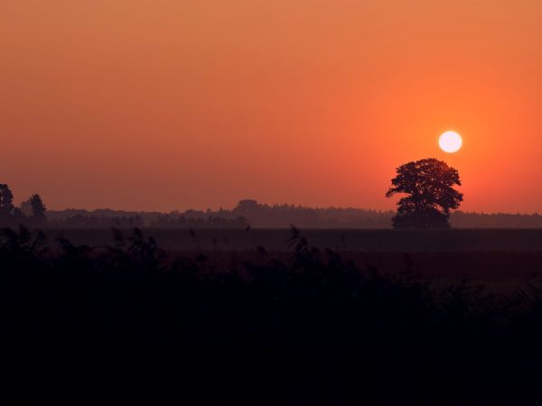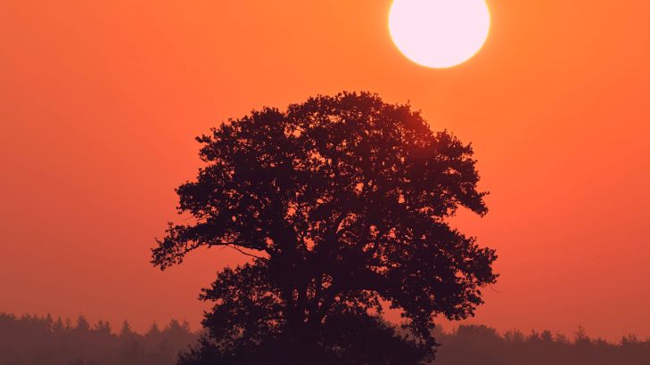 Belle silhouette détaillée d'un arbre au lever du soleil