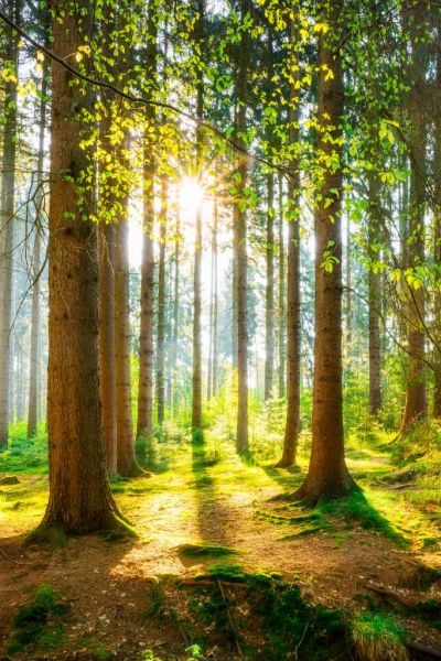 Das Foto gibt den Sonnenaufgang im sommerlichen Wald stimmungsvoll wieder.