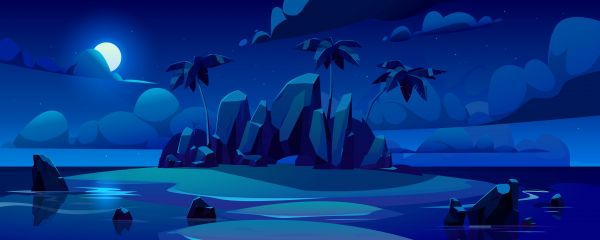 Île illustrée pendant la pleine lune avec des palmiers et des rochers.