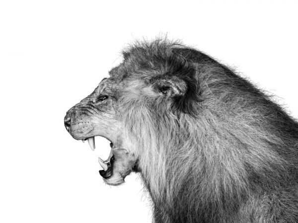 Cette image en noir et blanc montre le rugissement puissant d'un lion, avec des détails exquis dans sa crinière sauvage et ses dents imposantes. L'arrière-plan minimaliste souligne sa nature royale et sauvage, dégageant un sentiment de puissance et de domination.