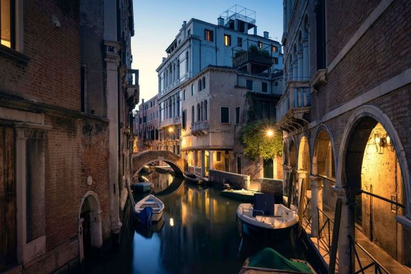 L'apparence romantique et apaisante fait de ce design un choix idéal pour les salons, les chambres à coucher et les établissements de restauration élégants qui souhaitent dégager un charme vénitien. La photographie urbex et la photographie de nuit capturent souvent la beauté cachée des villes historiques, et cette image fait revivre cette magie. Un choix magnifique pour les amateurs de Venise, d'éclairage d'ambiance et de l'élégance intemporelle d'un canal tranquille au crépuscule.