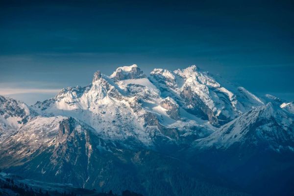 Les sommets glaciaires s'élèvent abrupt sous un ciel d'un bleu profond. La lumière douce du jour met en valeur la texture des rochers et des couches de neige, créant un impressionnant jeu de lumière, de froid et d'altitude.