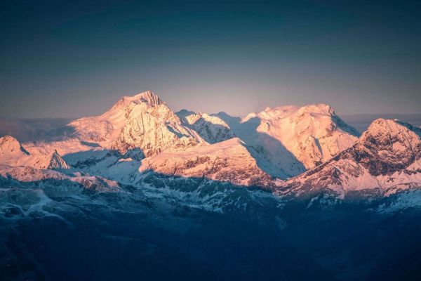 Un paysage montagneux majestueux baigne dans la lumière rose douce du matin. Les sommets enneigés capturent les premiers rayons du soleil, tandis que les vallées plus basses sont encore enveloppées dans une ombre bleue, créant un contraste puissant et une sérénité silencieuse.