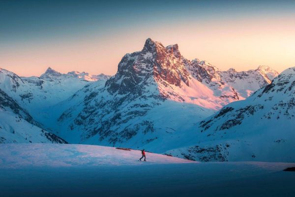 Un paysage montagneux imposant baigne dans la lumière chaude du soleil couchant. Des champs de neige glacée, des pics rocheux escarpés et des couleurs pastel douces créent ensemble une scène silencieuse et puissante pleine de profondeur et de sérénité.