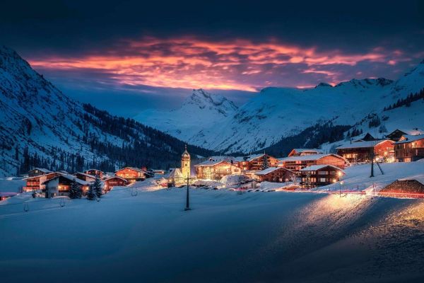 Lumière du soir sur un village de montagne enneigé