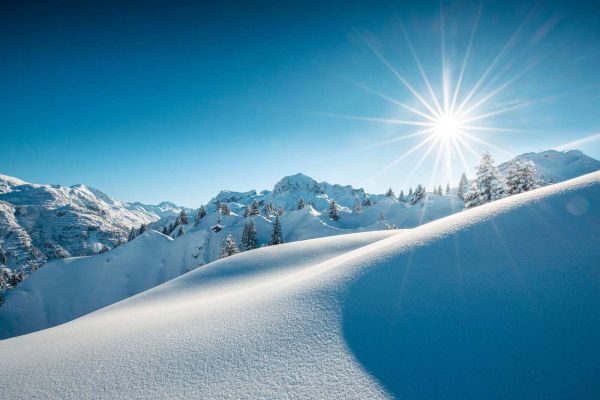 Rayons de soleil cristallins illuminent des dunes de neige douce dans un paysage montagneux, entourées de sapins enneigés et d'un ciel bleu azur. Une image pleine de calme, de fraîcheur et de lumière.