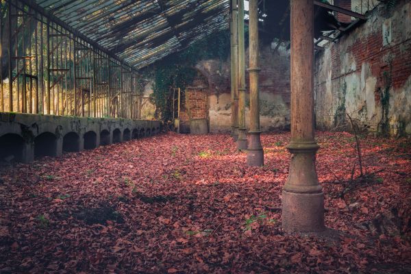 Maison abandonnée avec des feuilles en automne. Combinez ce papier peint dans votre maison pour un look industriel.
